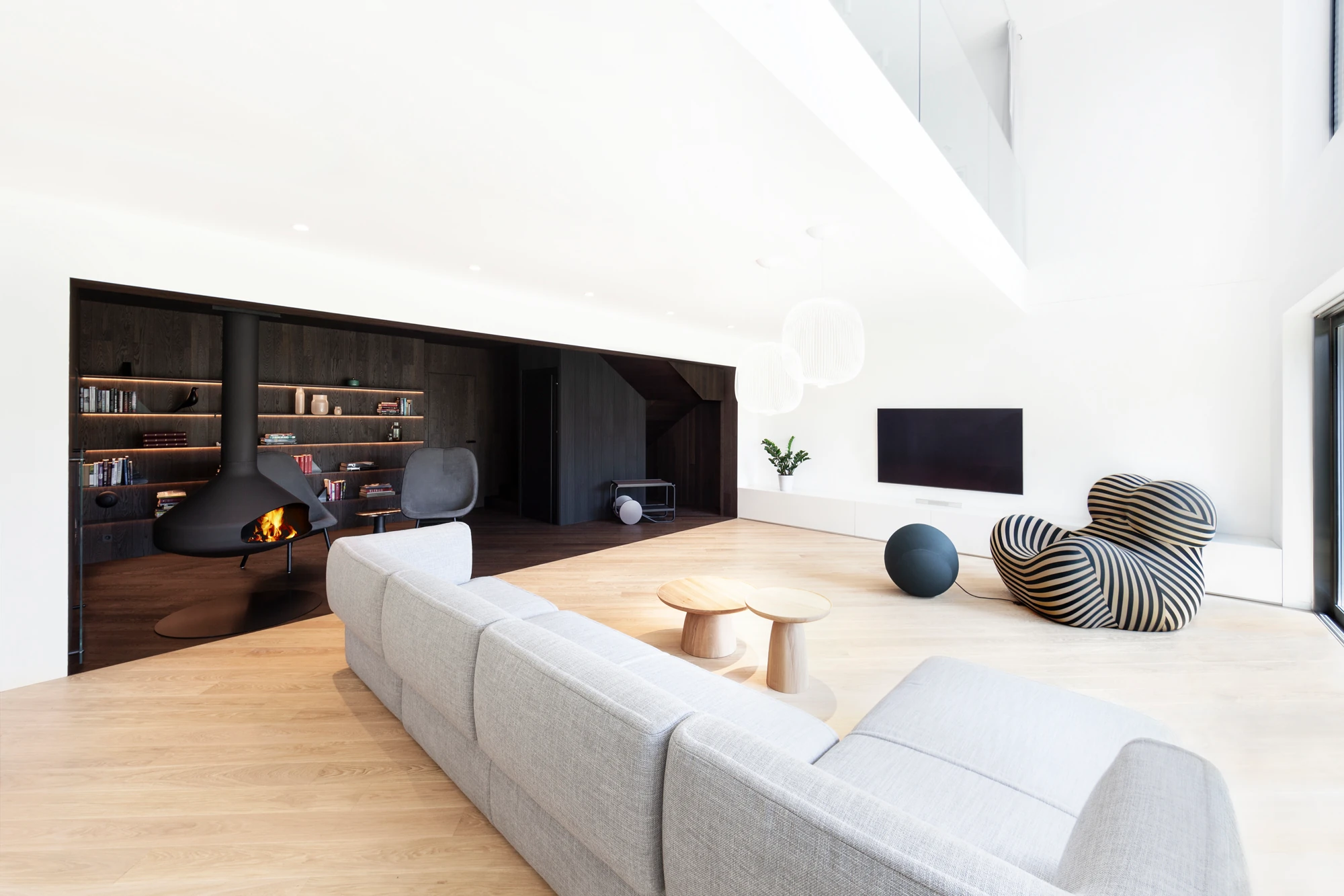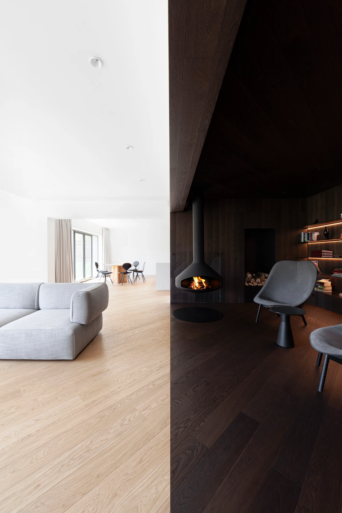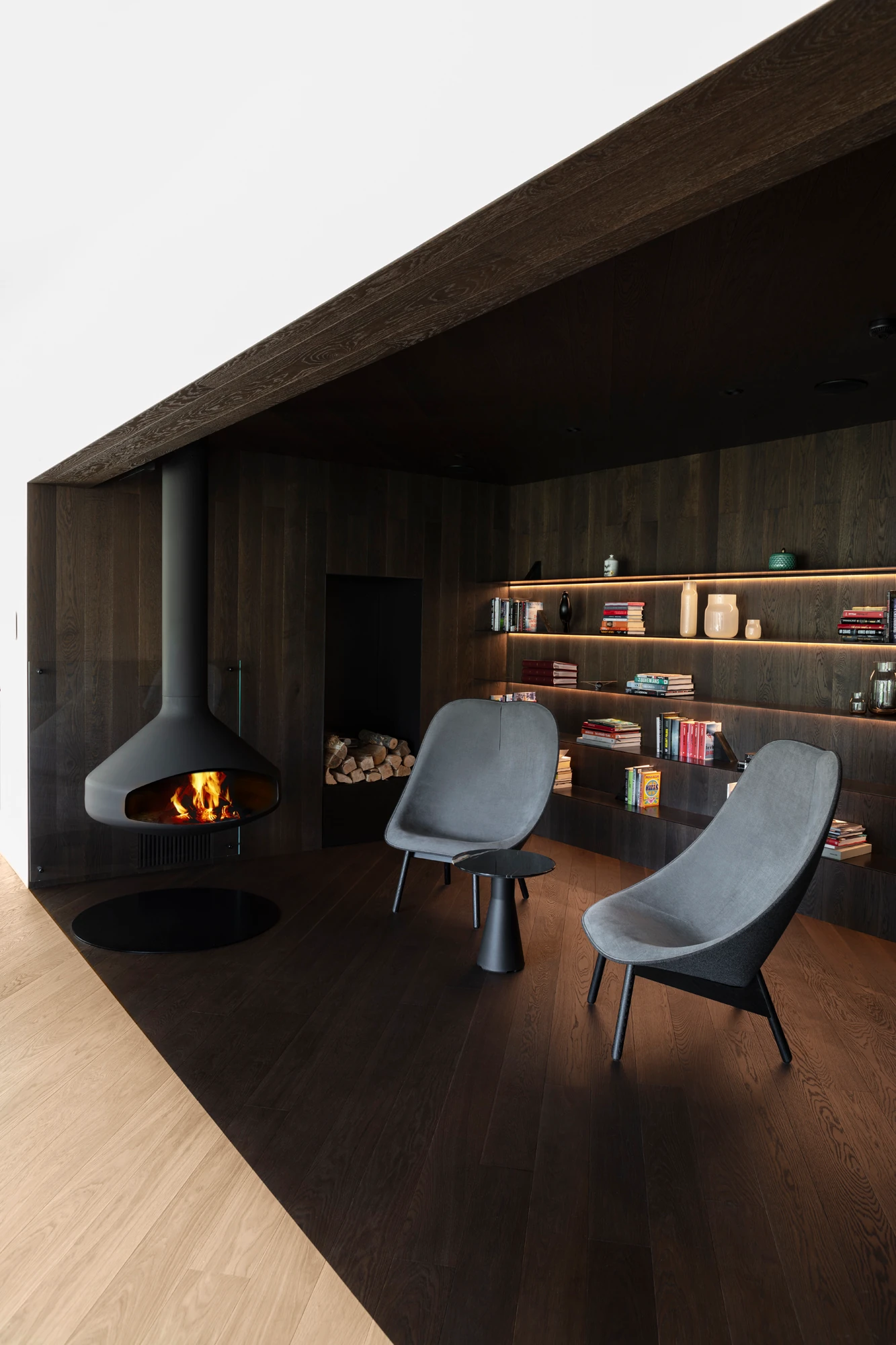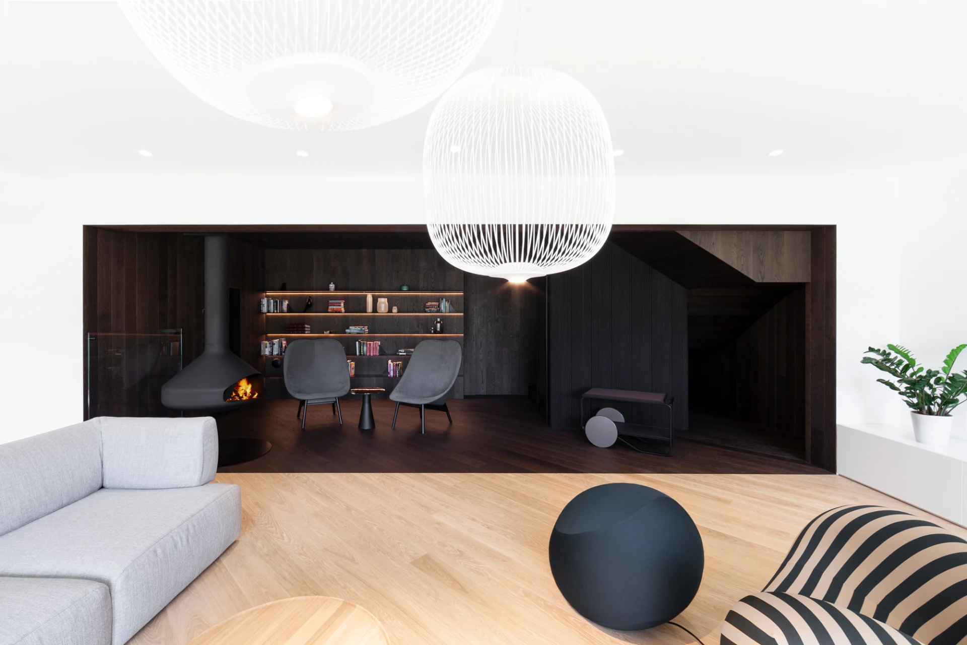 V prvním nadzemním podlaží, které je přístupné z ulice, se nachází garáž, uvítací hala a jedna ze dvou prostorných šaten. Do dalších prostorů domu vede schodiště v provedení tmavého odstínu dubové dýhy, a kromě něj jsou jednotlivá podlaží propojena také výtahem. V nejnižším podlaží, do kterého je otevřená galerie, se nachází velký centrální prostor sdružující obývací pokoj, kuchyni v černobílém provedení a jídelnu. Dominantou obývacího pokoje je ikonické křeslo UP od italské firmy B&B Italia. Ikonické křeslo a světlou pohovku pak doplňují konferenční a odkládací stolek HRIB, které designérské duo Vrtiška & Žák navrhlo pro slovenského výrobce Javorina. Obývací část pak plynule přechází v odpočinkovou zónu s posezením u krbu, výklenek, který je nejvýraznějším příkladem důmyslné práce s tonalitami dřeva – celý je vyvedený v tmavém provedení a s černými doplňky. Z tohoto patra, které je z pohledu od hlavního vstupu a komunikace již pod úrovní terénu, je pak také výstup na zahradu s venkovní kuchyní, posezením na terase a s vyhřívaným krytým bazénem s protiproudem.