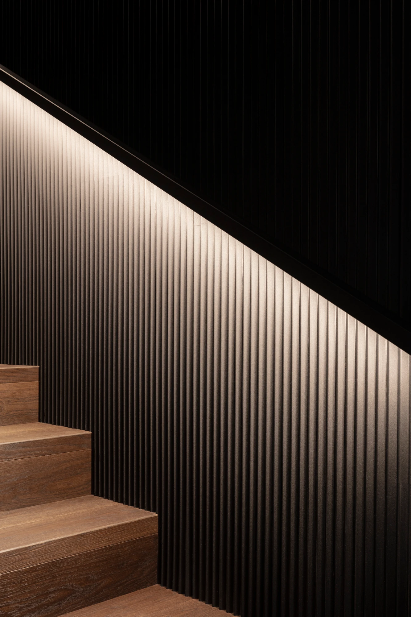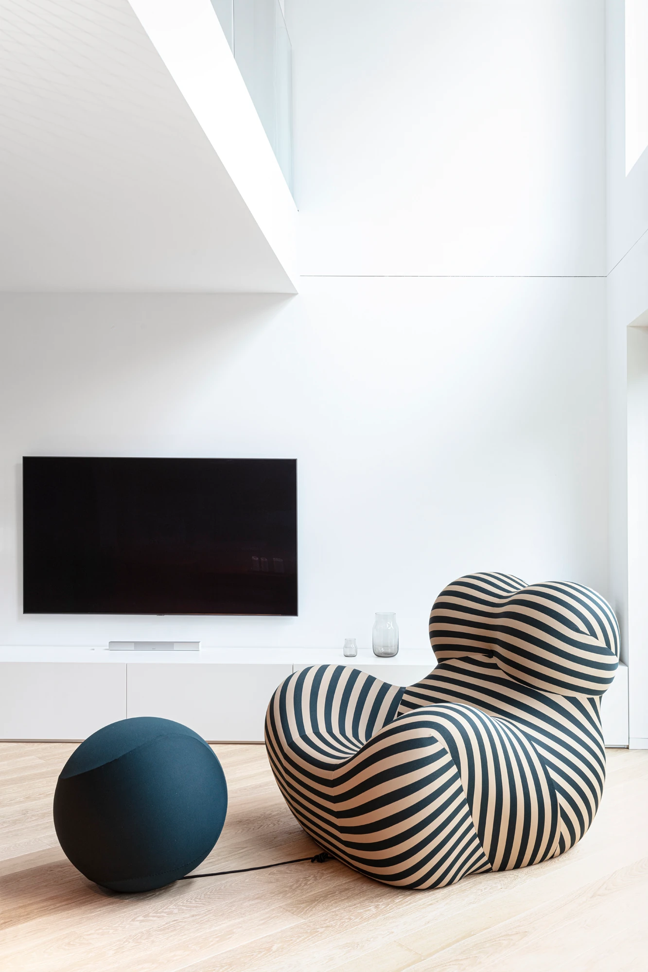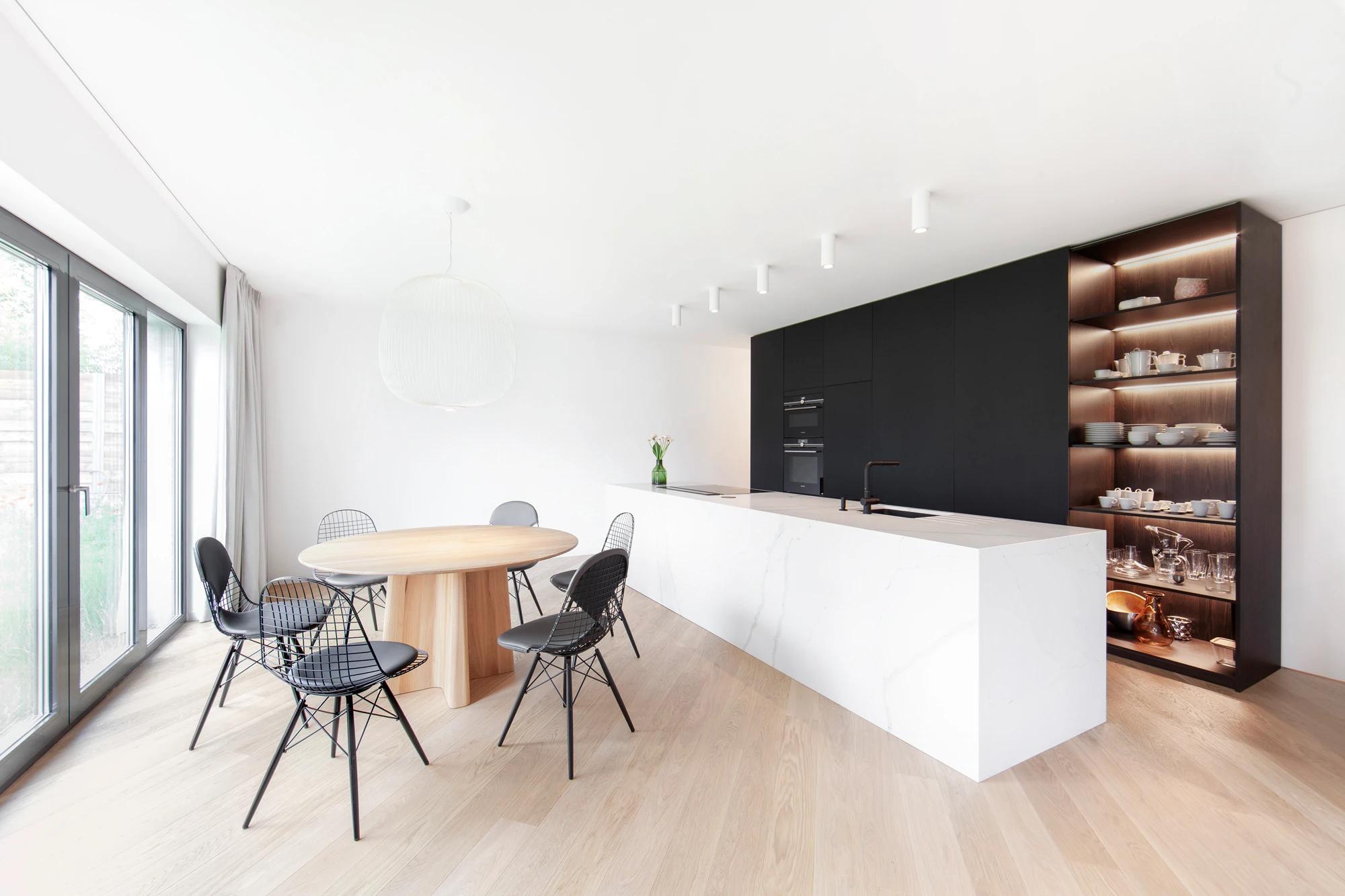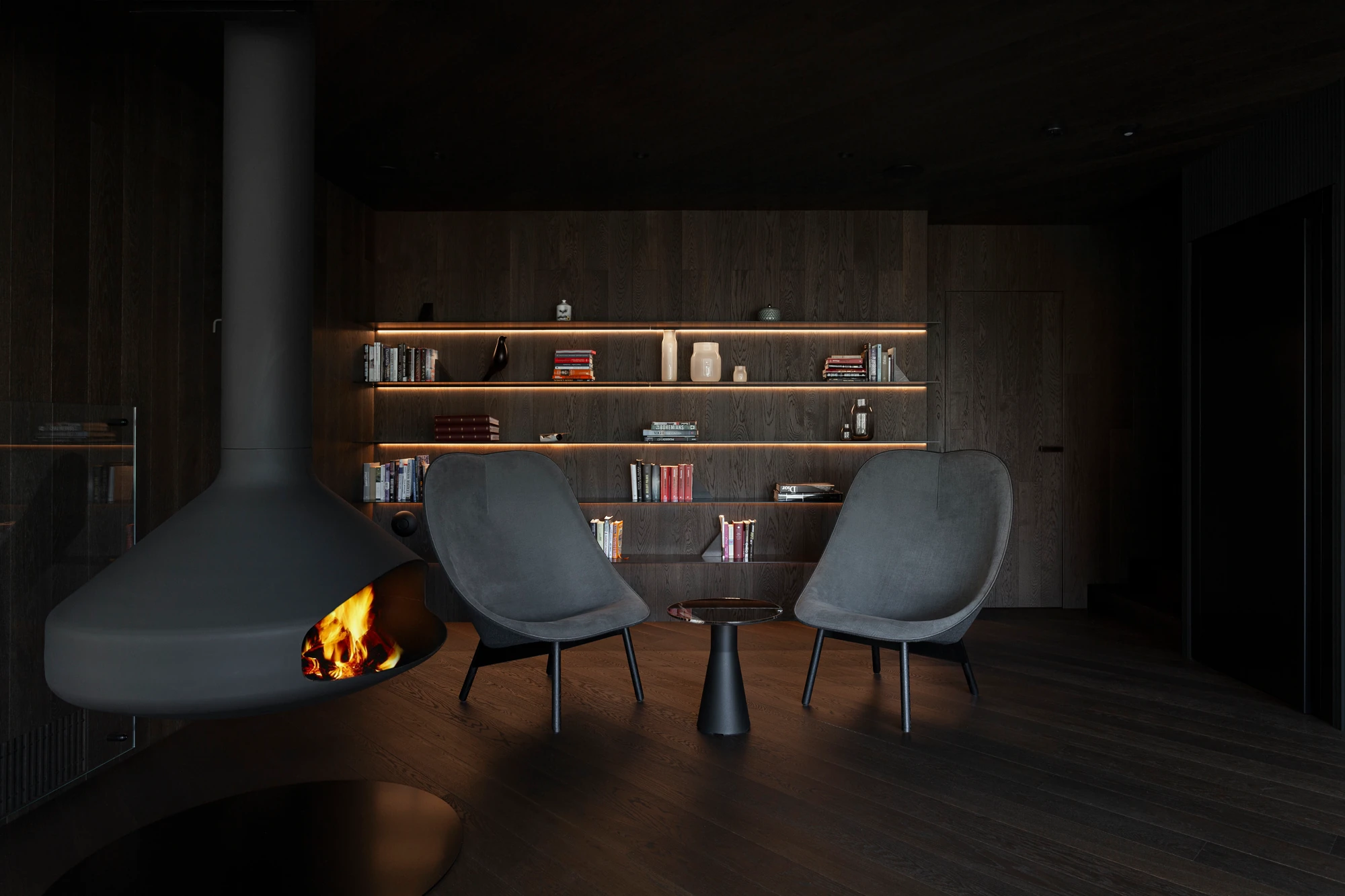 V prvním nadzemním podlaží, které je přístupné z ulice, se nachází garáž, uvítací hala a jedna ze dvou prostorných šaten. Do dalších prostorů domu vede schodiště v provedení tmavého odstínu dubové dýhy, a kromě něj jsou jednotlivá podlaží propojena také výtahem. V nejnižším podlaží, do kterého je otevřená galerie, se nachází velký centrální prostor sdružující obývací pokoj, kuchyni v černobílém provedení a jídelnu. Dominantou obývacího pokoje je ikonické křeslo UP od italské firmy B&B Italia. Ikonické křeslo a světlou pohovku pak doplňují konferenční a odkládací stolek HRIB, které designérské duo Vrtiška & Žák navrhlo pro slovenského výrobce Javorina. Obývací část pak plynule přechází v odpočinkovou zónu s posezením u krbu, výklenek, který je nejvýraznějším příkladem důmyslné práce s tonalitami dřeva – celý je vyvedený v tmavém provedení a s černými doplňky. Z tohoto patra, které je z pohledu od hlavního vstupu a komunikace již pod úrovní terénu, je pak také výstup na zahradu s venkovní kuchyní, posezením na terase a s vyhřívaným krytým bazénem s protiproudem.