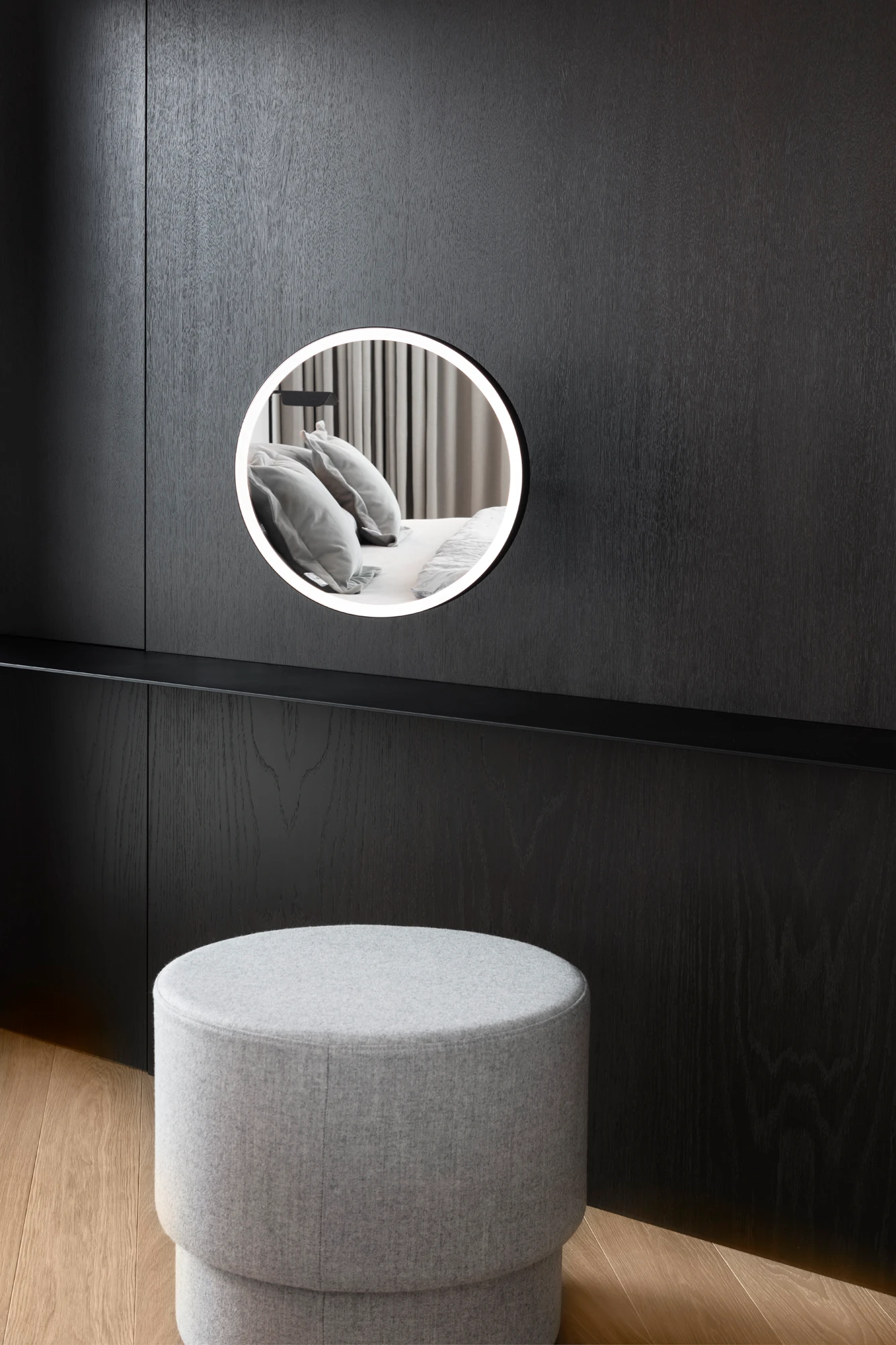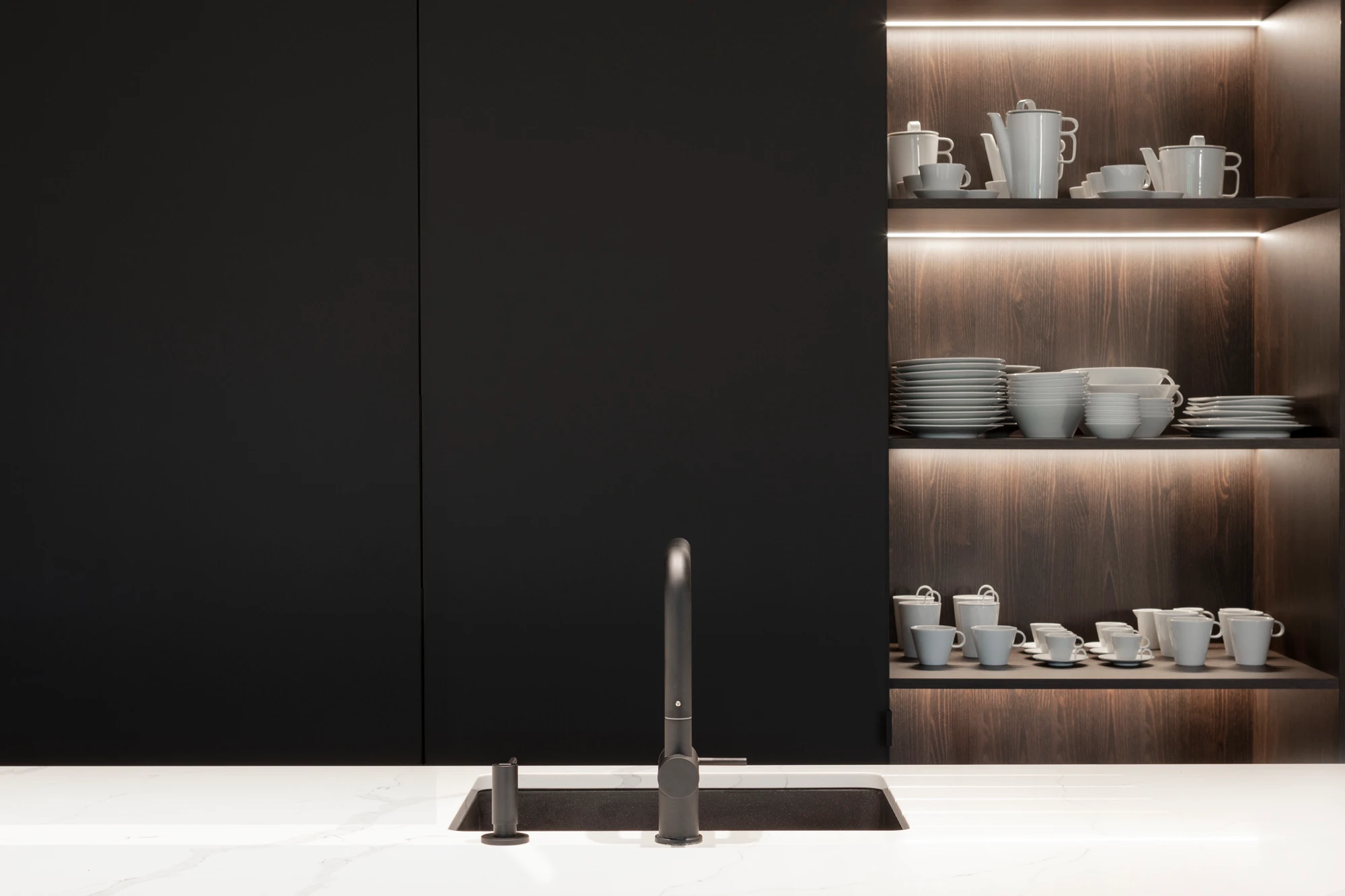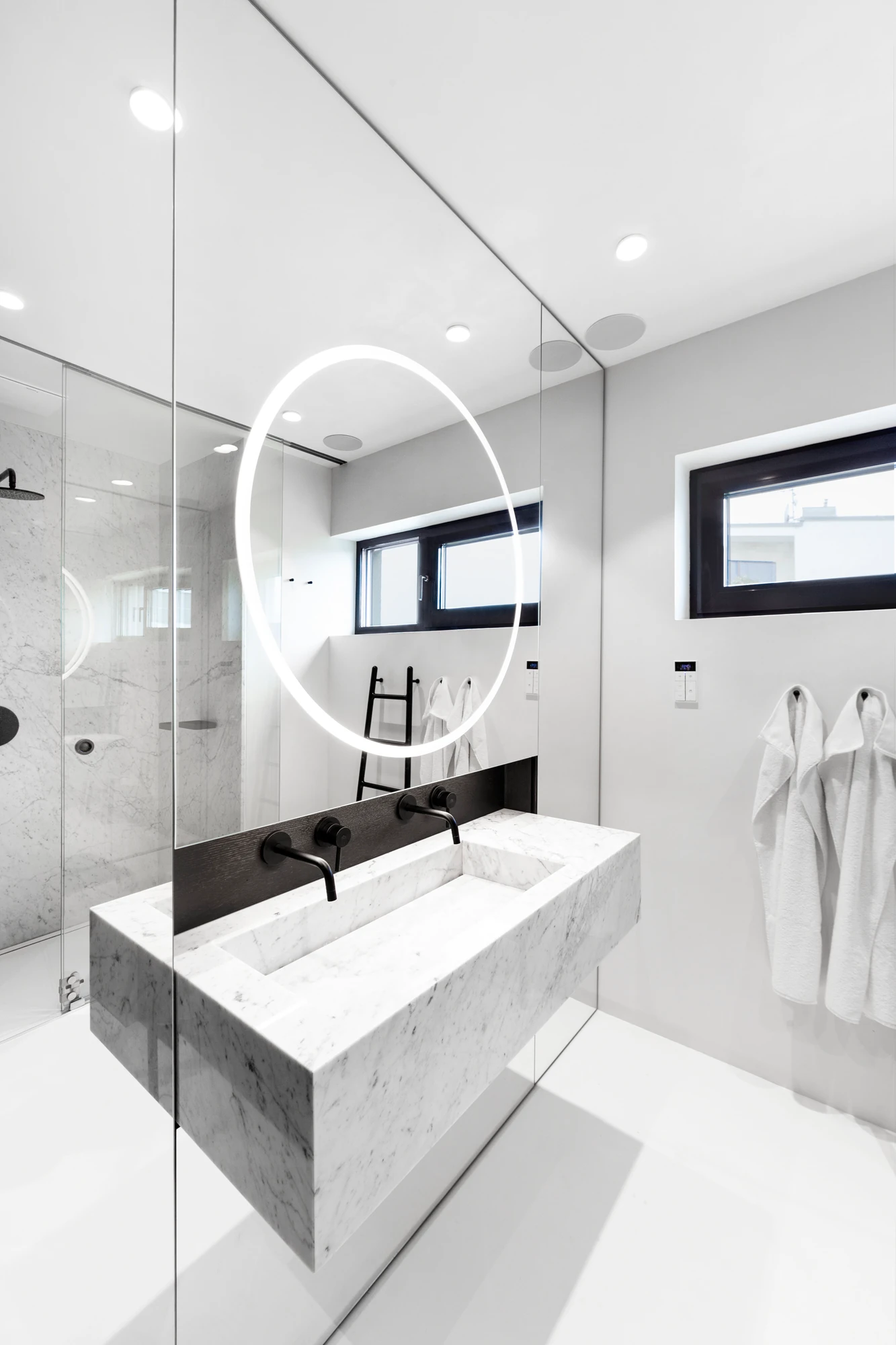 Velké plochy materiálů pak autoři doplnili zařizovacími prvky v kontextu pojetí celého interiéru tak, aby na sebe zbytečně neztrhávaly pozornost. A i proto zvolili kliky MINIMAL z dílny rodinné manufaktury M&T.