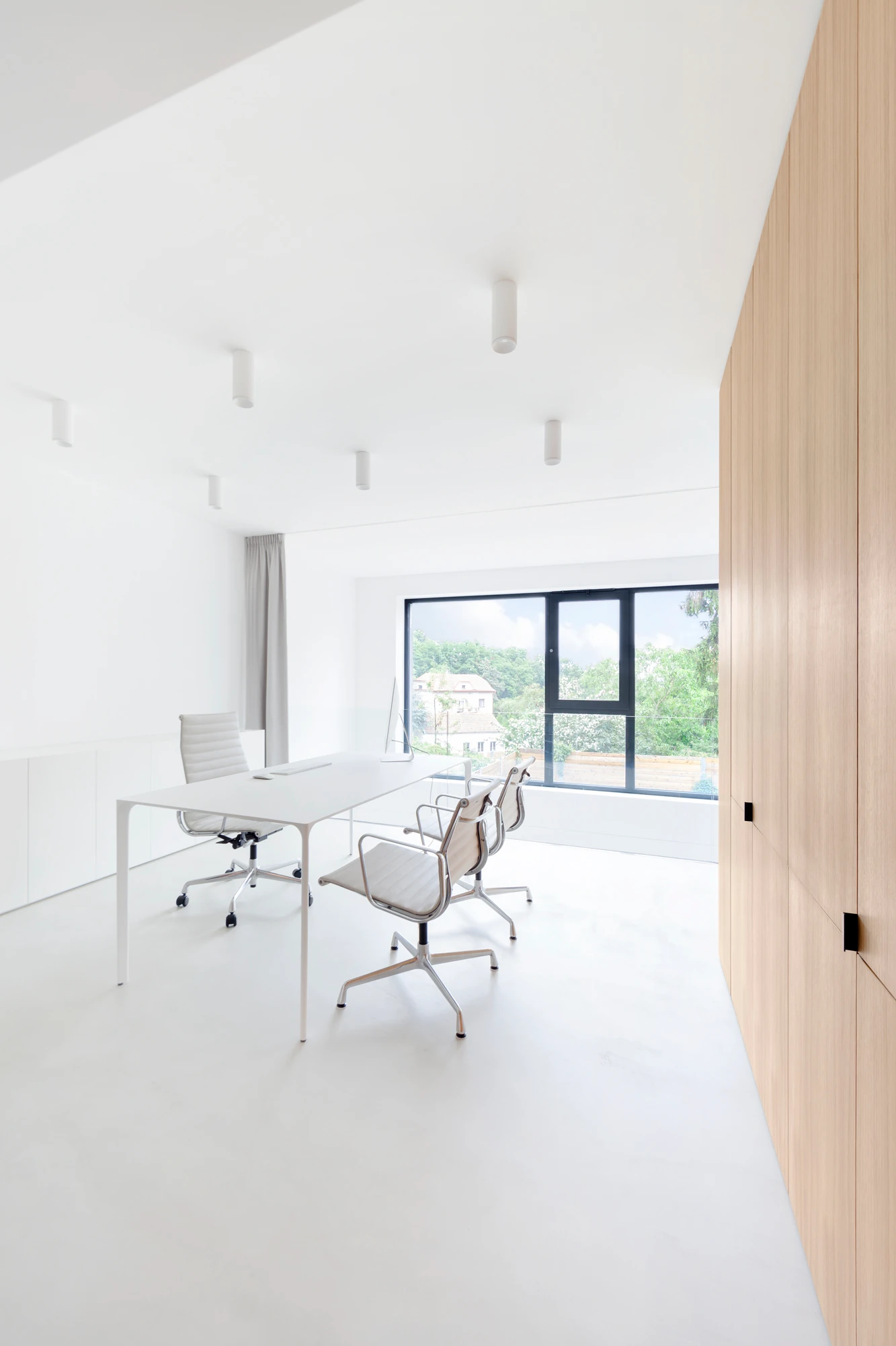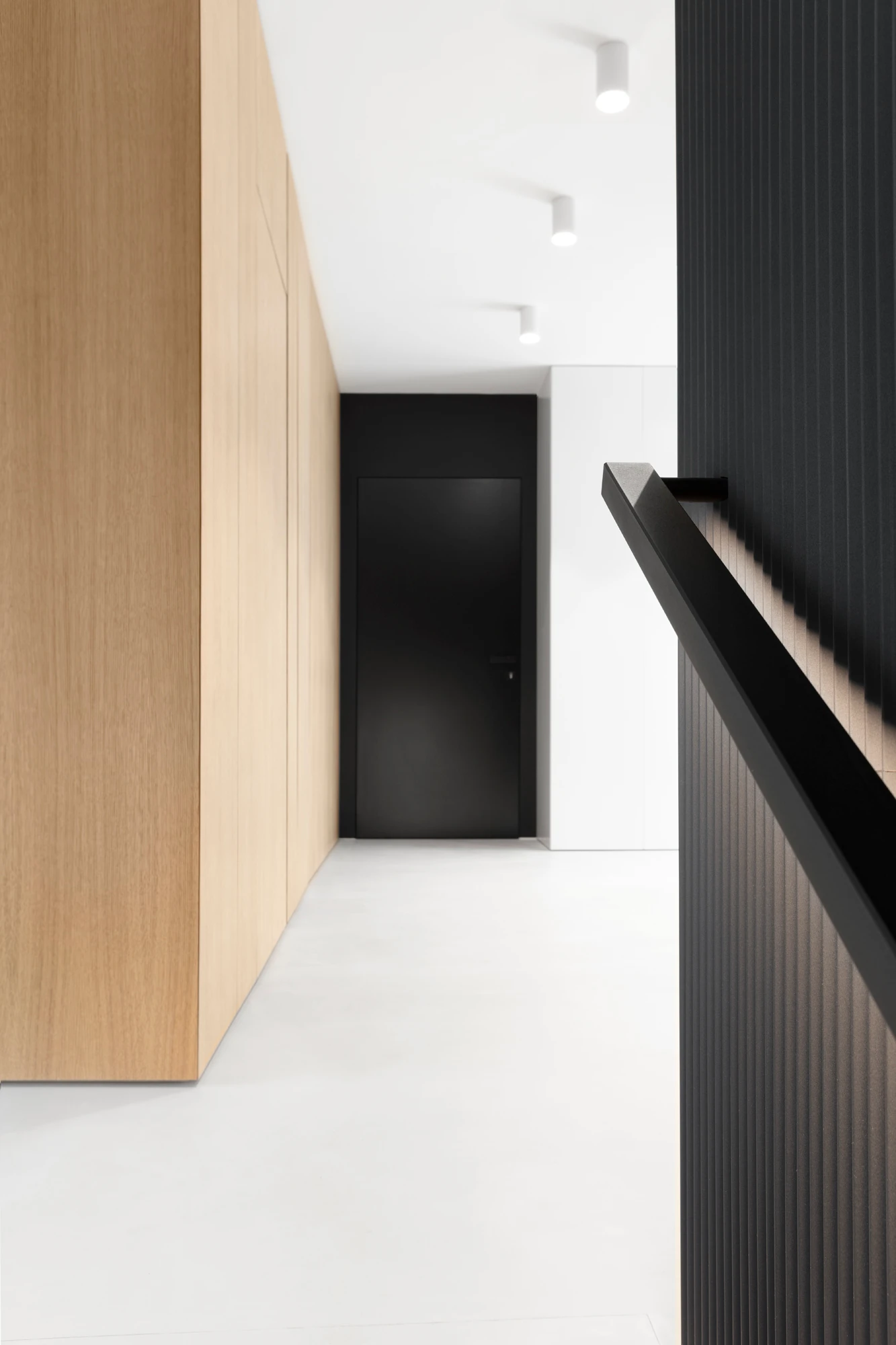 „Při výběru klik do celého domu jsme jednoznačně vsadili na mimikry – přáli jsme si takové, které přirozeně splynou s povrchem dveří. Svým dokonale minimalistickým tvarem tuto podmínku jednoznačně splňovalo kování MINIMAL s rozetou nepřesahující obrys samotné kliky. A jelikož v interiéru střídáme tmavé a světlé dveře, potřebovali jsme na to reagovat,“ líčí designéři Vrtiška & Žák.