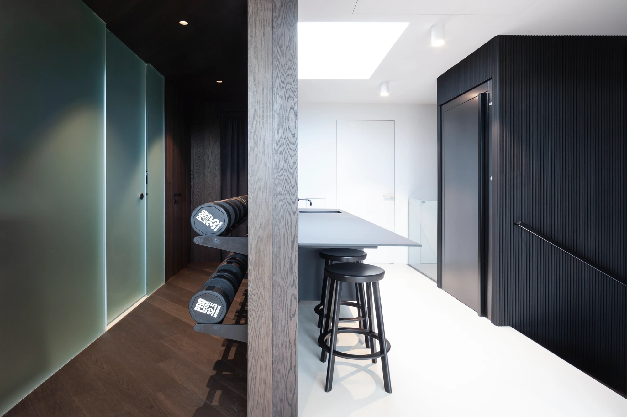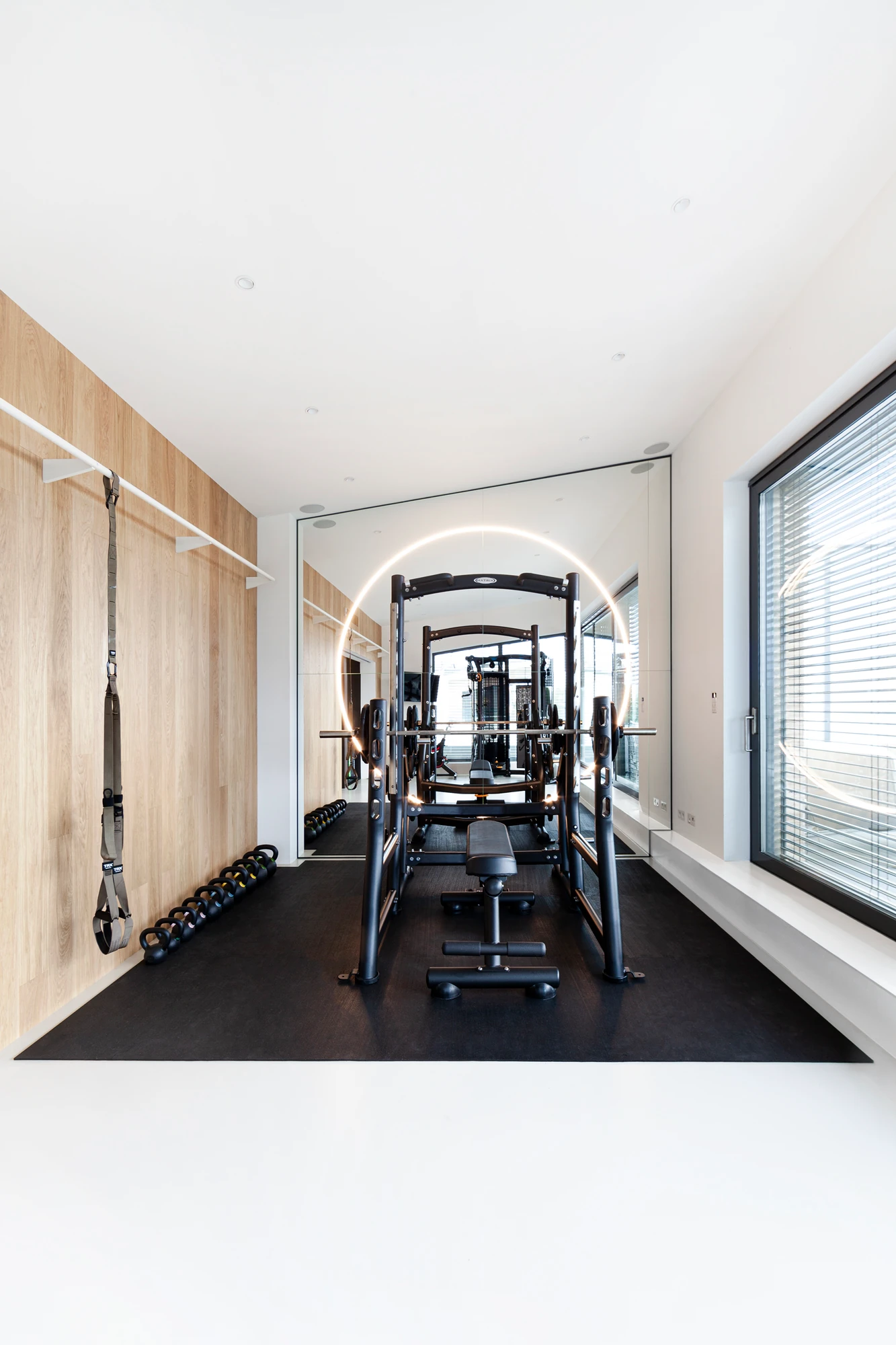 Celé čtvrté patro je věnováno tréninkové aktivitě, součástí je také ledová lázeň, bar a koupelna. Posilovna pak plynule navazuje na venkovní terasu.