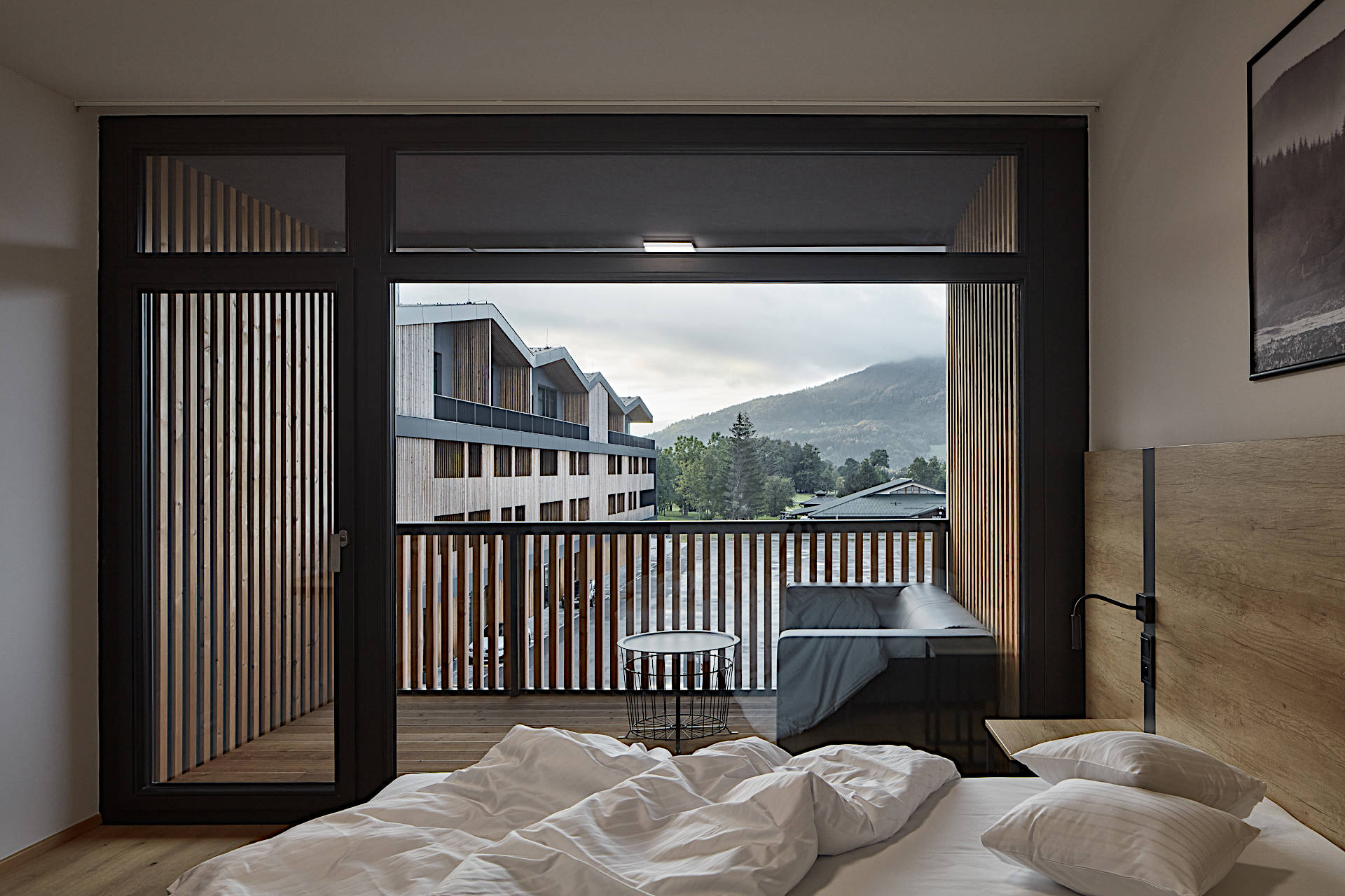 Návrh apartmánového domu Tee House Čeladná svým tvarem plně respektuje okolí beskydských hor a díky použitým materiálům se stává součástí přirozeného krajinného rázu.