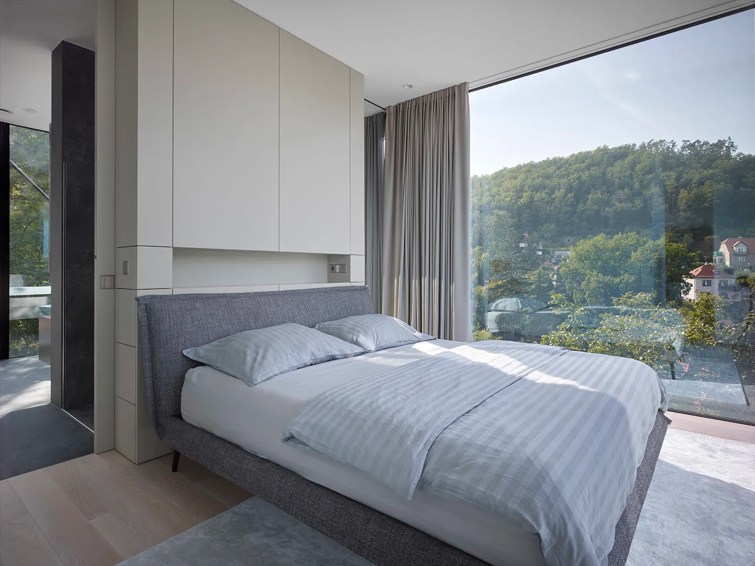Strmý pozemok vily sa nachádza na severnej tienistej strane terénnej vlny. Je to jeden z najstrmších a najvyšších. To mu dáva množstvo výhod, ako aj nevýhod či výziev na zadanie. Najkrajšie výhľady do údolia Berounky, lemované kopcami Českého krasu a siluetou hlavného mesta Prahy v pozadí, sú nepochybne jej najväčším klenotom. Preto bolo cieľom poskytnúť tento výhľad vo všetkých obytných miestnostiach z toho najlepšieho uhla. Koncept vychádzal z princípu závesných domov. Tým sa eliminovali nevýhody, využili výzvy a maximalizovala hodnota pozemku. Zvíťazila forma mostnej konštrukcie na pilieroch. Dom tak pripomína oceľovú lávku, ktorá spočíva na strmom svahu v otočenej polohe smerom k najlepším severným výhľadom a južnému slnku.