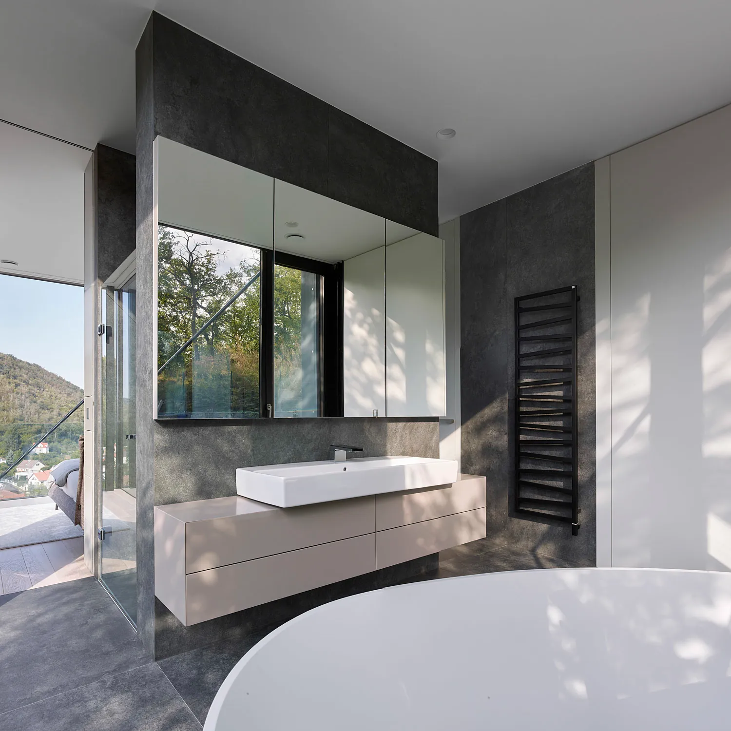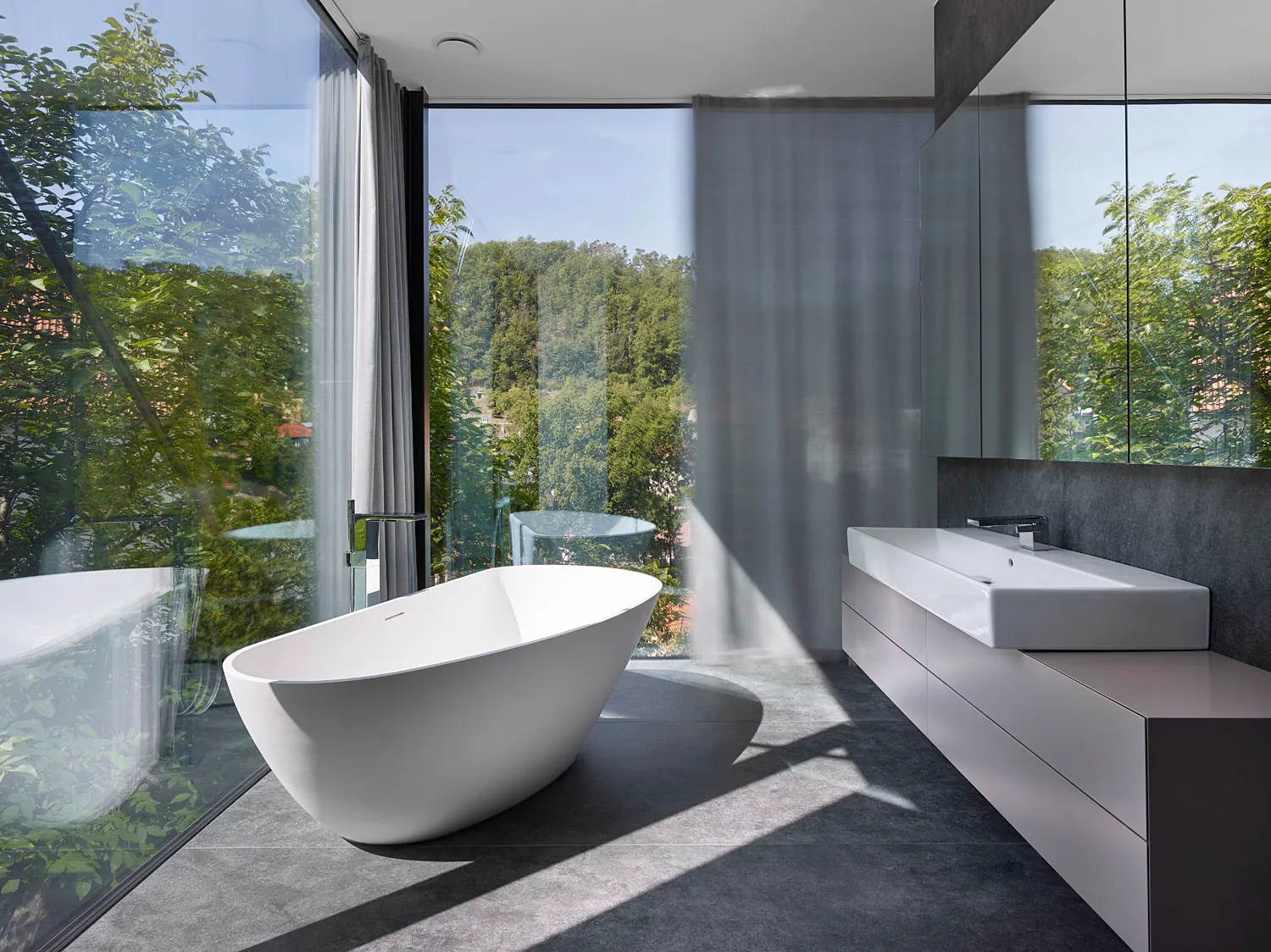 Stavebný a technologický experiment Villa Sidonius pripomína oceľovú lávku, ktorá sa týči nad strmým svahom v otočenej polohe, s najlepším severným výhľadom a južným slnkom.